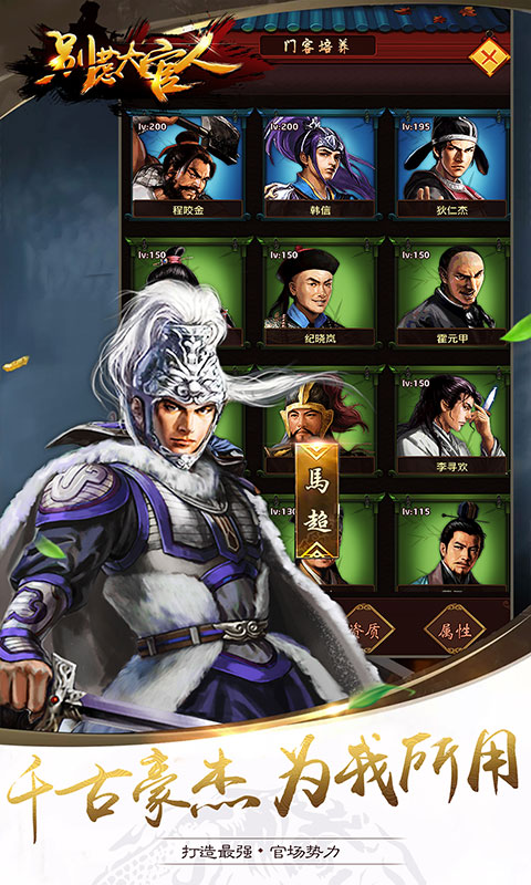 《别惹大官人》是一款经营养成官斗手游,游戏以当官第一视觉生动呈现,娶妻纳妾、生孩养娃、家族结盟、联盟争霸、培养门客、玩家PK 、多人社交等精彩玩法。